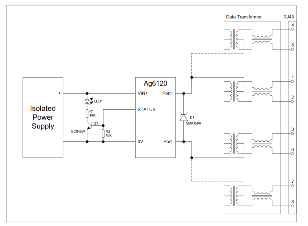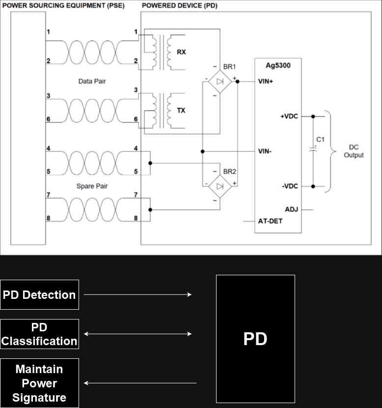 The PoE Protocol works by having a galvanically isolated PSU (44-57V) at the ‘back-end’, connecting to a Power Sourcing Equipment (PSE) controller at the ‘front-end’, handshaking with a Powered Device (PD) (a buck converter) at the power delivery point. The system diagram(s) below should help digest the system setup.